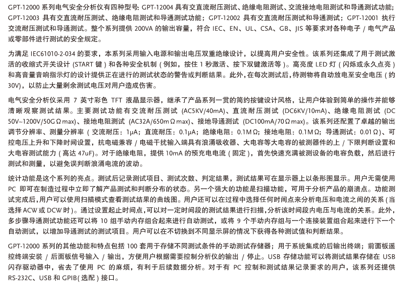 GW Instek推出GPT-12000系列旗舰型电气安全分析仪(200VA输出容量),符合IEC 61010-2-034的安规测试仪(测量,控制和电气需求的安全要求)实验室使用特殊要求测量设备的绝缘电阻和测试设备的电气强度,控制和实验室使用对绝缘电阻测量设备和电气强度测试设备的特殊要求)),规定了软体的要求和在设计高压和绝缘电阻测试,测量仪器时必须遵循硬体介面,以确保在使用仪器时为用户提供必要的保护和警告。