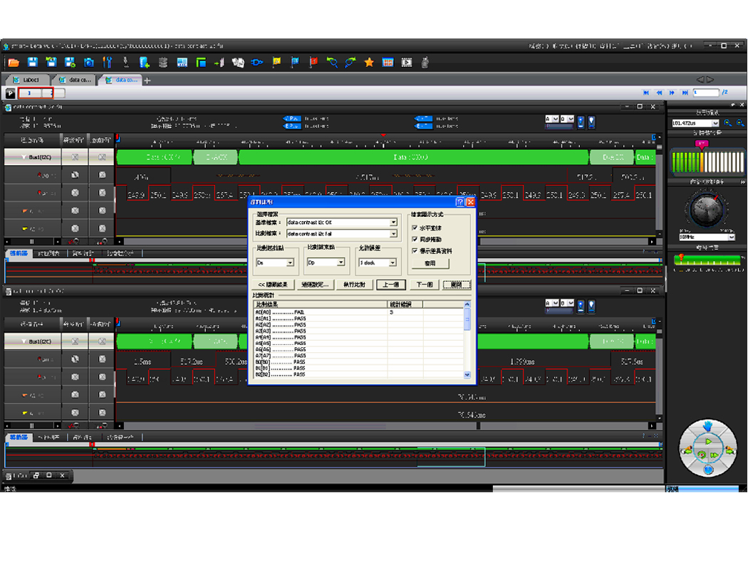 利用数据比对功能可将两个LA存盘进行波形比对,数据比对功能会自动将两笔存盘内波形差异点以橘红色引号来标示,将备份文件取出与现状档案做Data Compare的动作,迅速找出问题点,不用再Step Into慢慢查找。
