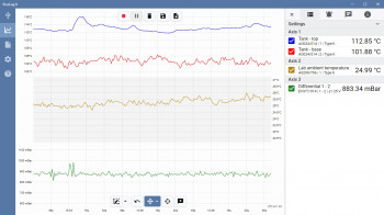 对于每个通道的测量单位不同的多通道记录应用程序,或者当通道测量范围两端的值时,添加额外的图形轴也是的。例如,同时测量超过 1000 °C 的炉内温度和环境温度需要两个轴,以便两者的细节可见。您一次最多可以查看四个具有不同范围的轴。