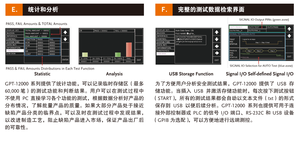 GW Instek推出GPT-12000系列旗舰型电气安全分析仪(200VA输出容量),符合IEC 61010-2-034的安规测试仪(测量,控制和电气需求的安全要求)实验室使用特殊要求测量设备的绝缘电阻和测试设备的电气强度,控制和实验室使用对绝缘电阻测量设备和电气强度测试设备的特殊要求)),规定了软体的要求和在设计高压和绝缘电阻测试,测量仪器时必须遵循硬体介面,以确保在使用仪器时为用户提供必要的保护和警告。