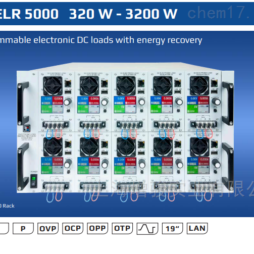 EA-ELR 5000直流电子负载专门设计成可配置成多通道直流电子负载的。在一个19"的机柜系统内,可以安装 10台功率为320 W的直流负载模块。每个模块可独立操作,但是要求机柜内安装能量转换的DC-AC逆变设备。模块还可扩展,可将模块的直流输入端并联起来。负载模块有两种输出电压,一个是80 V,一个是200 V。并且配有通用的调整模式:恒压(CV) ,恒流(CC)与恒功率(CP)。
