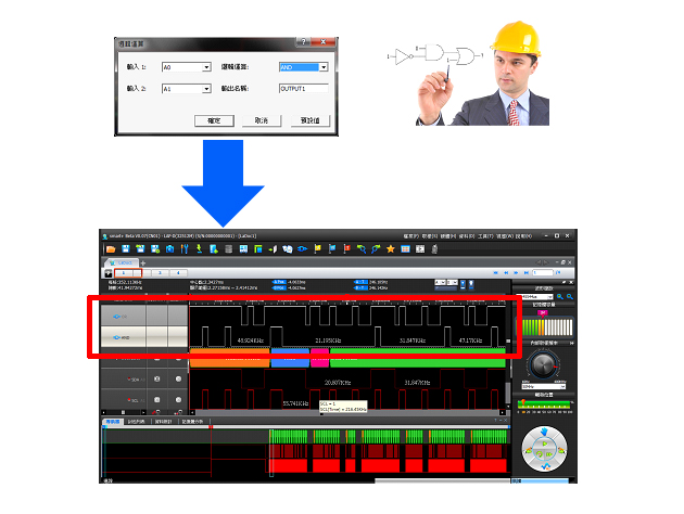 使用者只需点选icon,即可设定信号信道中任意两组作为逻辑运算输入,经由Smart+快速计算逻辑输出状态并同步显示于波形显示区内,方便工程师在设计电路中,仿真计算数字信号所产生的讯号结果。Smart+所支持的逻辑闸AND、OR、NAND、NOR、XOR、XNOR及NOT等。