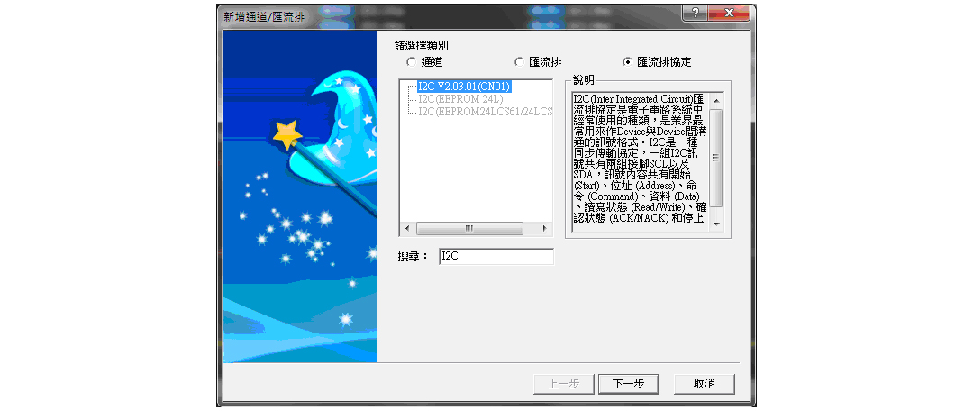 直接一动鼠标并点击信道名称叫出总线精灵,即可将讯号归纳成总线,设定选项有三项一般信道、总线以及总线协议,在总线协议中直接在搜寻键入总线关键词即可快速查找出总线协议。