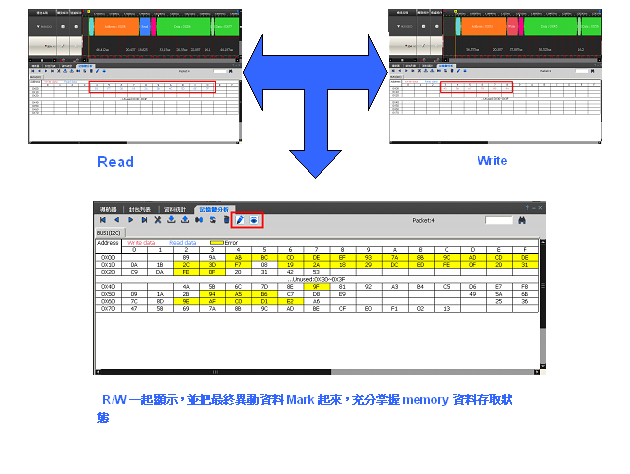 此功能不仅仅只是纪录,每个封包是读是写也可单独分析,更能显示后内存每个地址的异动状态,使工程师能快速的除错验证与比对分析数据,加速项目的进行。
